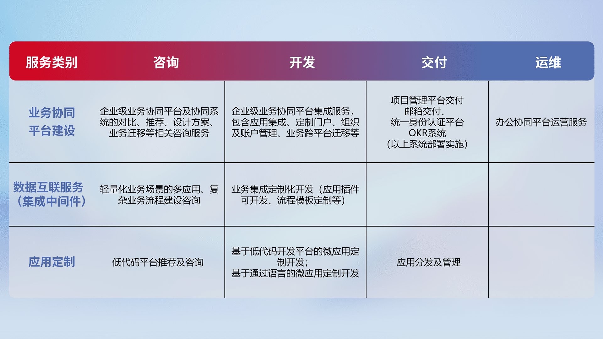 针对钉钉、、、、企微、、、、IDaas等平台级产品提供产品的规划、、、、方案、、、、交付、、、定制化开发等服务,,,,实现如统一协同办公、、、、智能客户服务、、、、混合会议管理、、智能数据查询、、、等业务场景,,实现数字化转型。。。。