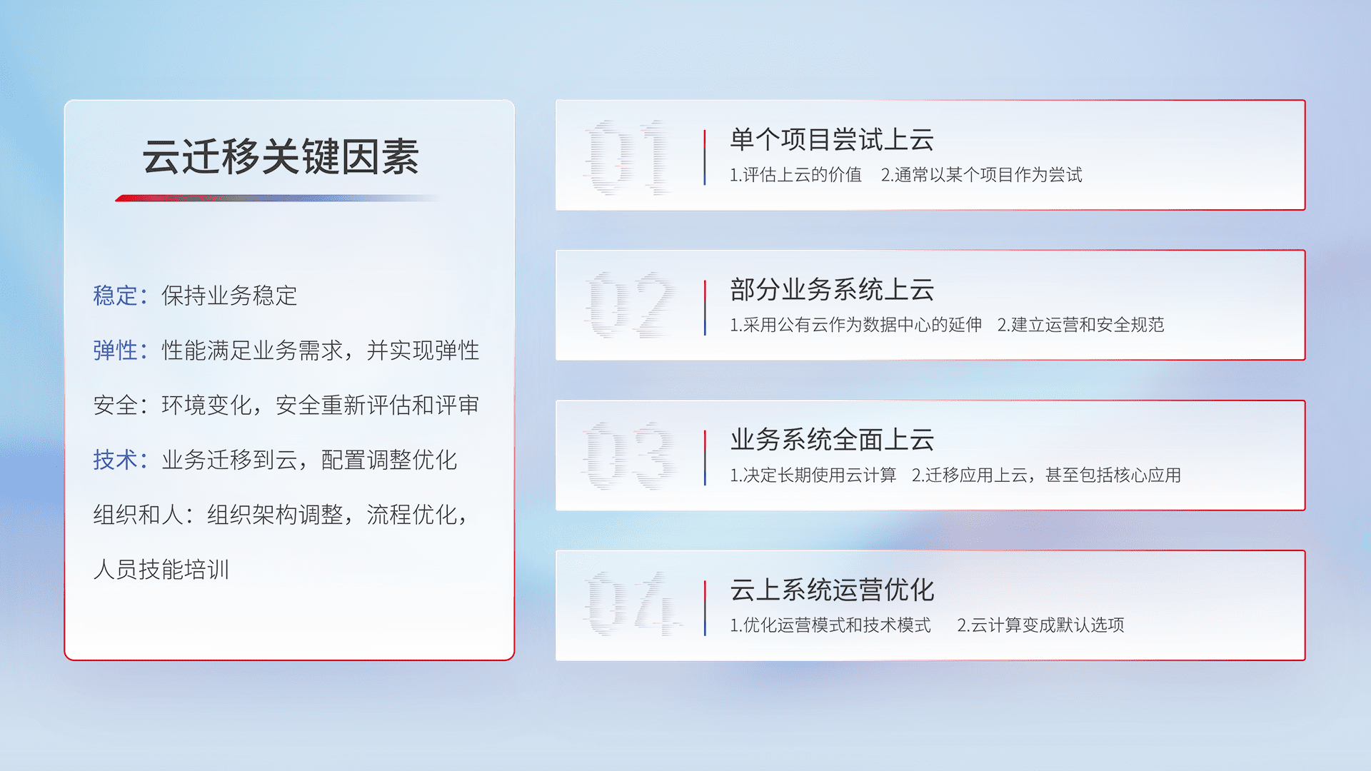 结合实际业务,,,从规划设计、、、云平台选型、、云原生改造、、、数据迁移、、、集成交付,,,迁移全过程为客户识别最佳上云路径,,,,做好风险识别管理,,设计网络架构、、、身份权限、、安全审计合规、、操作审计、、、日志审计、、、监控告警策略、、、多站点容灾设计等,,,对云上基础设施进行整体规划,,,,提升IT治理水平,,,,以满足弹性、、高可用、、、高性能的需求。。。。