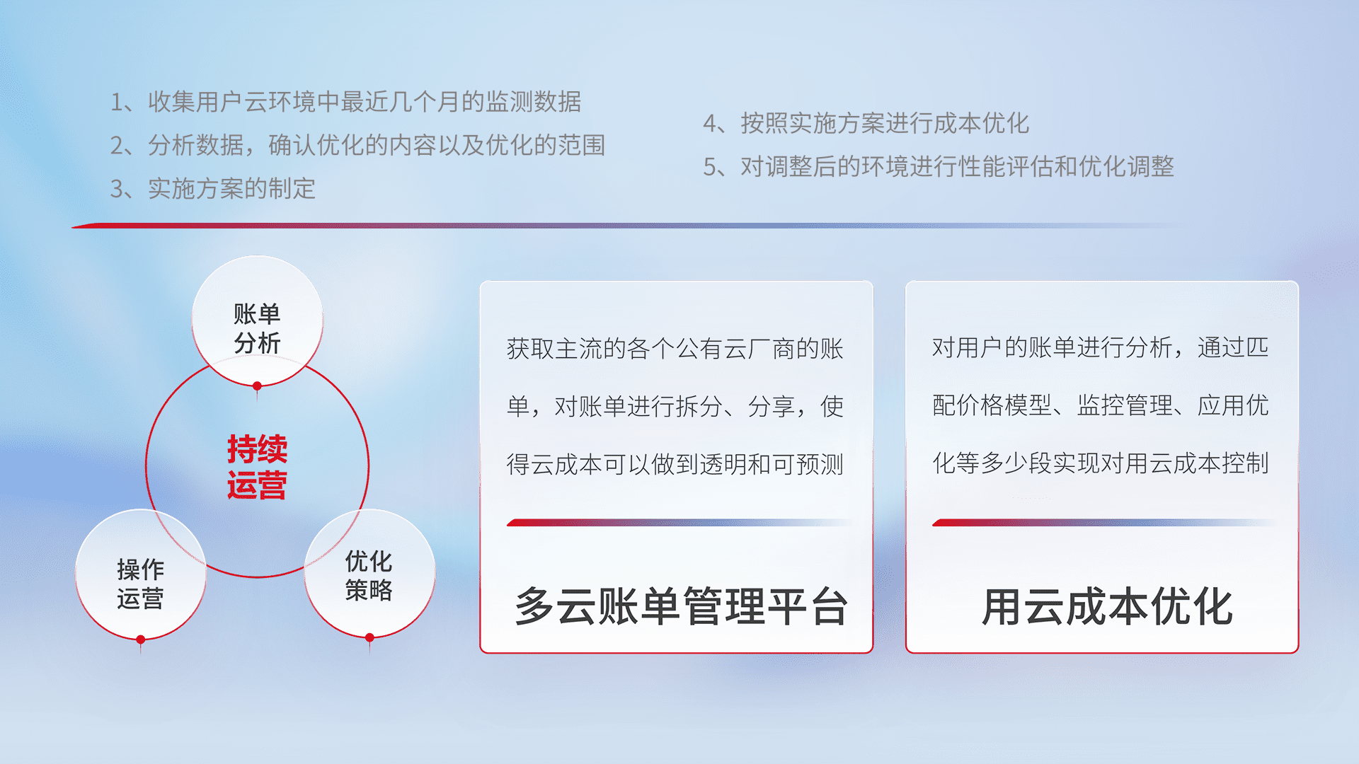 通过多云纳管,,,以统一的资源数据模型把客户的云资源进行抽象和封装,,进而实现对多云资源的统一操作,,保障云资源管理的可靠性、、、、稳定性与可用性。。。量身定制化运维内容,,,,配置、、、开发运维、、、、补丁管理、、、、备份、、、、监控、、、、认证和访问管理、、、审计和日常巡检等,,,,保障在用云过程中的可靠度,,,稳定度以及高可用率。。